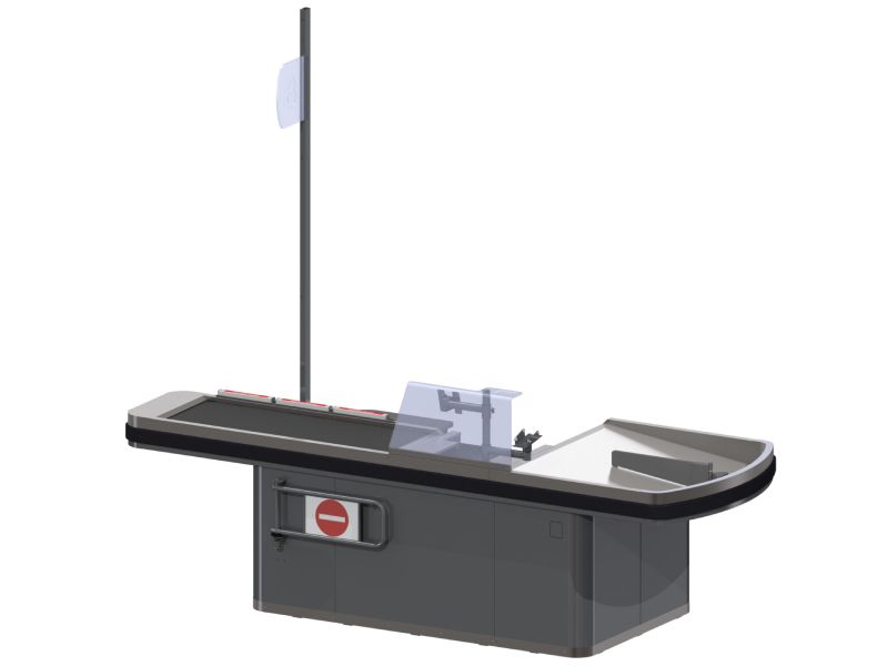 Plexi, nosač POS i monitora, divajder u koritu, nosač displeja, plexi zaštita štampača, boks za cigarete visoki, fioke za cigarete,dodatna polica u centralnom delu, vrata centralne baze, police za kese, kapija zatvoreno, letvica sledeći kupac, fioke za novac